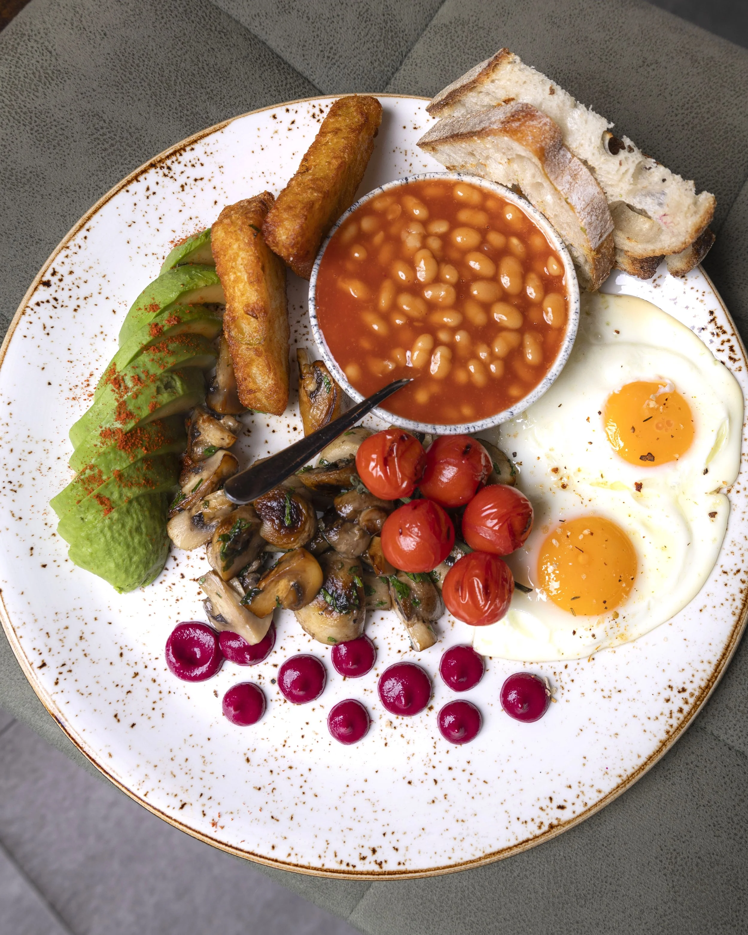two free-range eggs, roasted cherry tomatoes, mushrooms, hash browns, sliced avocado, baked beans, served with toasted sourdough bread